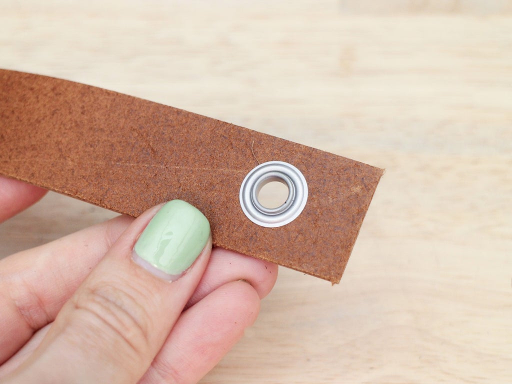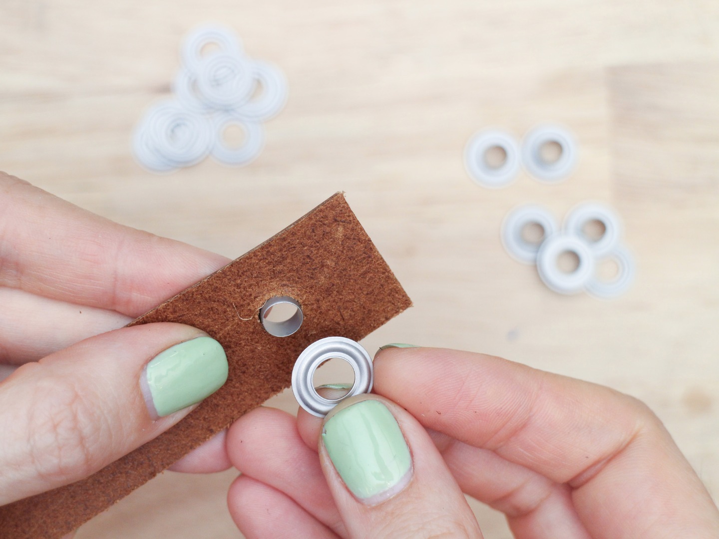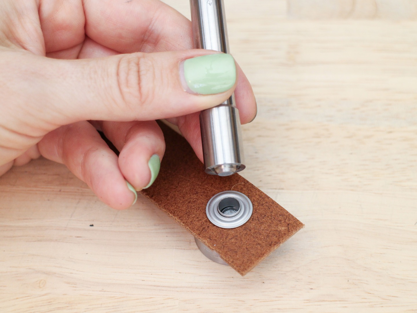 Once you have a big enough hole punched, push the larger top piece of the grommet through from the grain side and slide the smaller bottom ring over the central stem on the flesh side.
