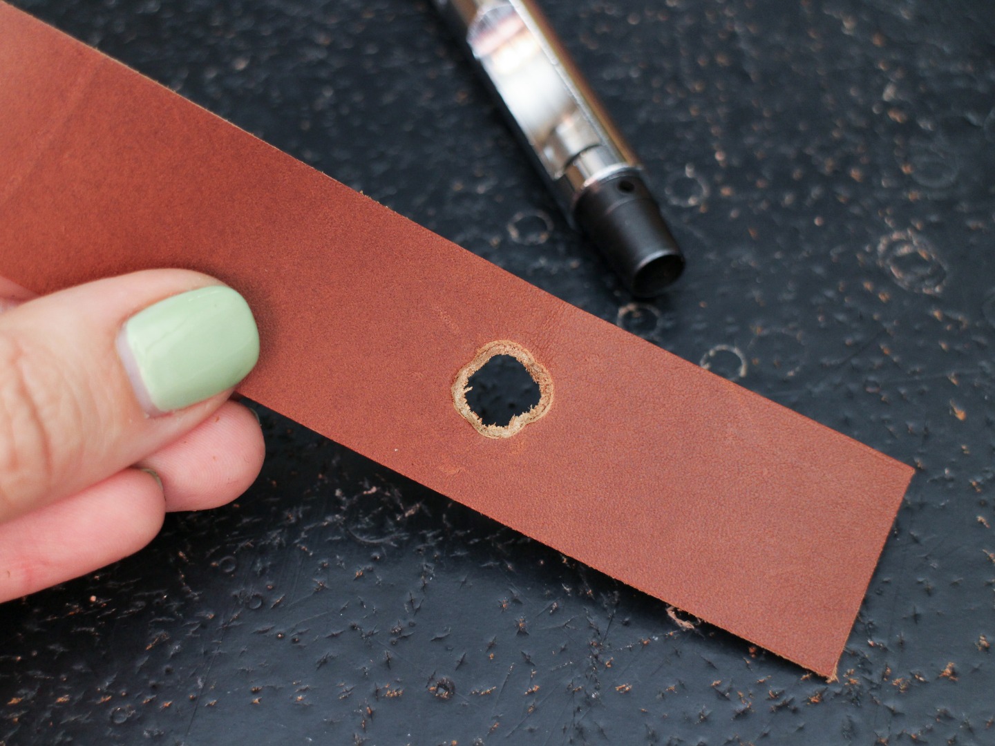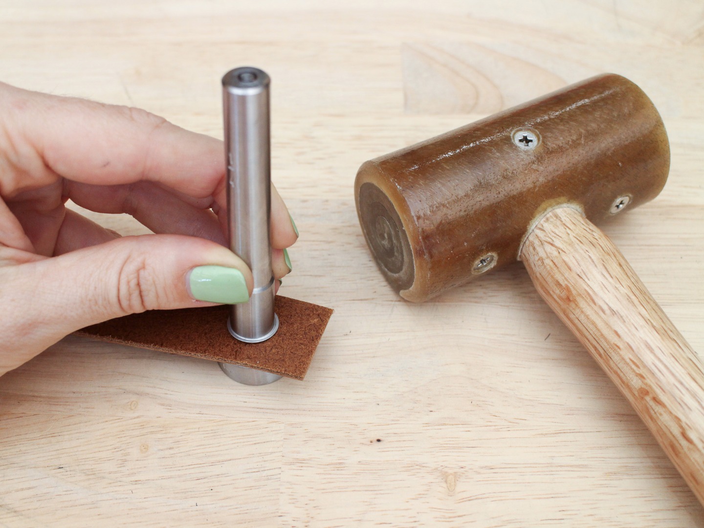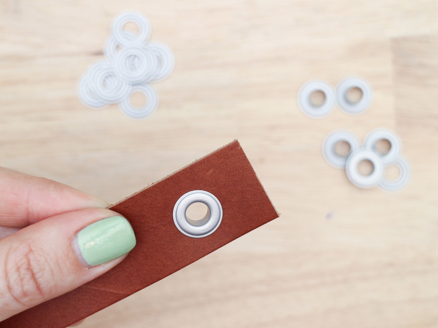 Once you have a big enough hole punched, push the larger top piece of the grommet through from the grain side and slide the smaller bottom ring over the central stem on the flesh side.