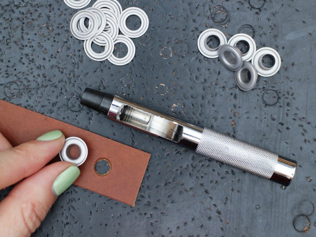 To set a grommet you first need to cut a hole the right size, which is often bigger than standard leather hole punch sizes. Grommet setting kits sometimes come with punches the right size, or you can buy them separately. You can also just use your largest existing hole punch and punch several times to create a large enough, if slightly misshapen, hole.