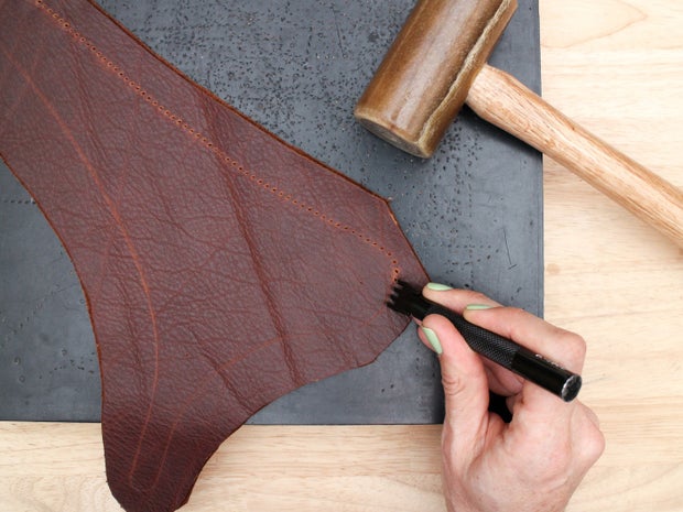 Now trace the sewing lines of your pattern onto the leather (I cut my paper pattern pieces out along the sewing lines instead of the cutting lines, and then just traced around the edges). Punch sewing holes along these lines with a stitch chisel or an awl.