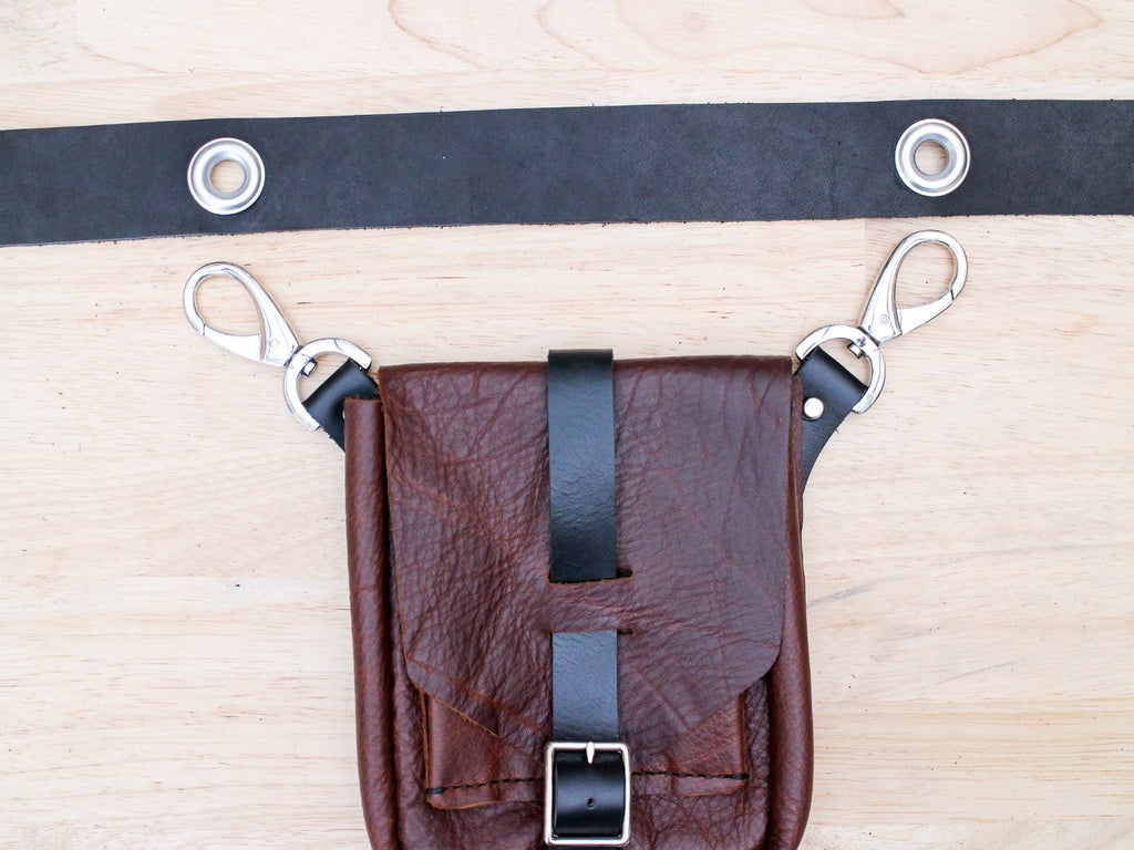 One way to do this is to attach swivel snaps strap loops of the bag. Then you can use these to clip and unclip the bag to an attachment point on the belt. I did this here by setting two grommets into the belt where the bag can attach.