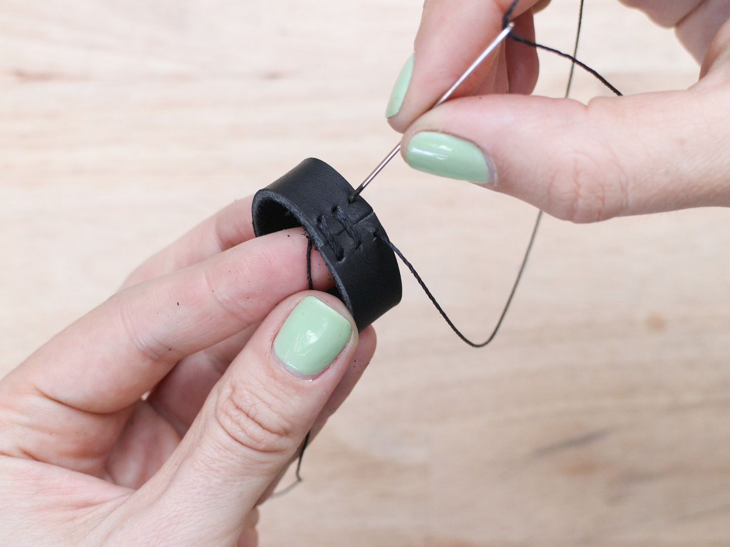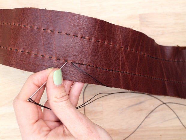 Sew around the leather, attaching the two layers of the strap or belt with a saddle stitch.