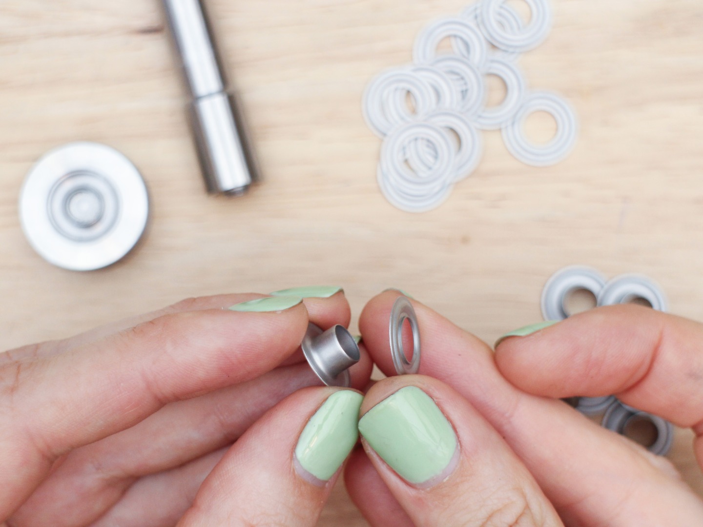 Grommets come in all different sizes and each size needs a different setting tool, which can be annoying. The setting tools have two parts like a snap setter. A concave base that holds the top of the grommet and a shaft with a shaped end that you use to hammer the two pieces together.